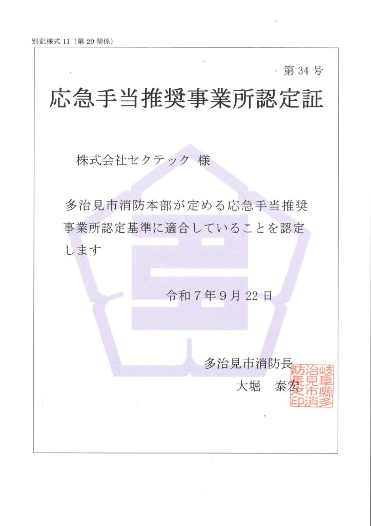 多治見市消防本部様が普及している応急手当に関する正しい知識と技術を習得ための、救急救命講習を受講し、応急手当推奨事業所として認定されました。